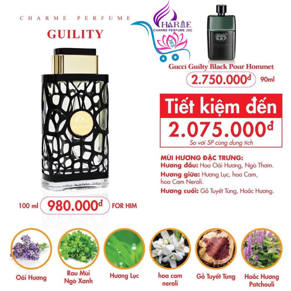 👉Charme Guility có mùi hương khiêu khích và mê mẩn như: hoa oải hương, rau ngò kết hợp với hoa cam, hoa cam neroli, hương lục cùng với tuyết tùng, hoắc hương tạo nên một cá tính rất đàn ông và cực kỳ độc đáo.